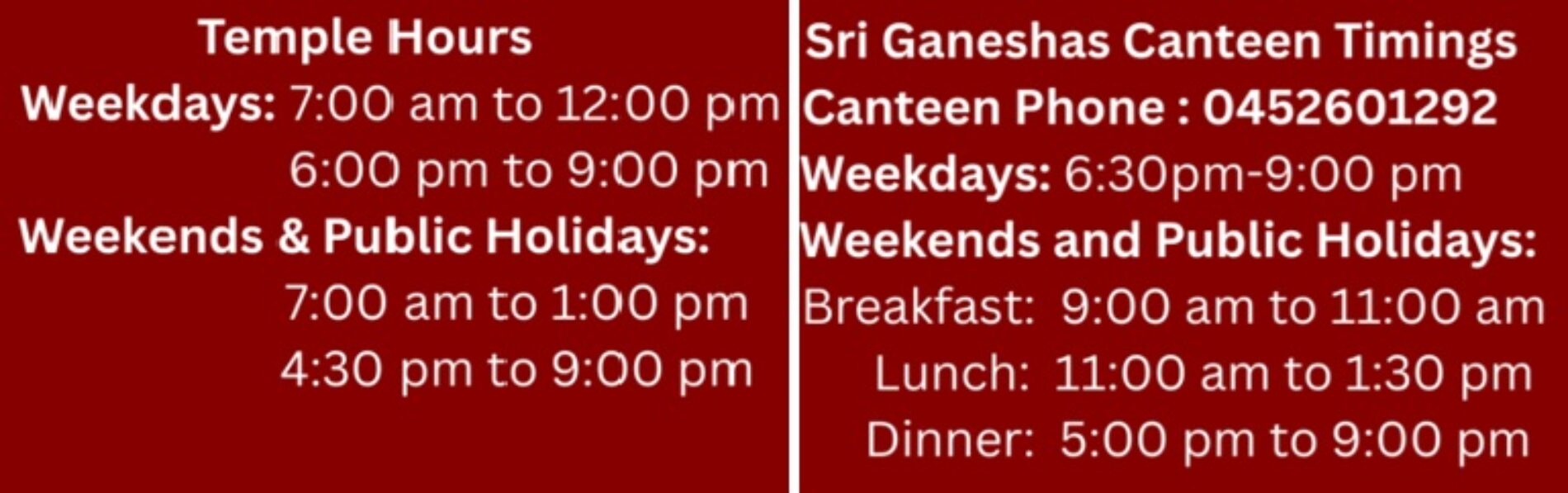 Sri Vakrathunda Vinayagar Temple - Melbourne, Australia Temple opening hoursWeekdays: 7:00 am to 12:00 pm and 6:00 pm to 9:00...